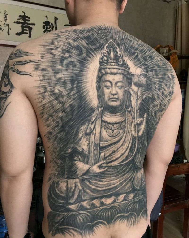 佛光普照纹身图片_背部欧美写实鬼神原创石雕成品纹身图案