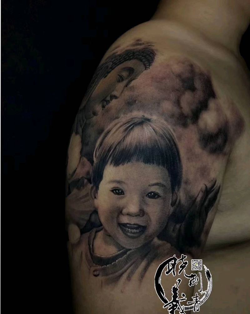 肖像 守护佛纹身图片_手臂欧美写实纹身图案