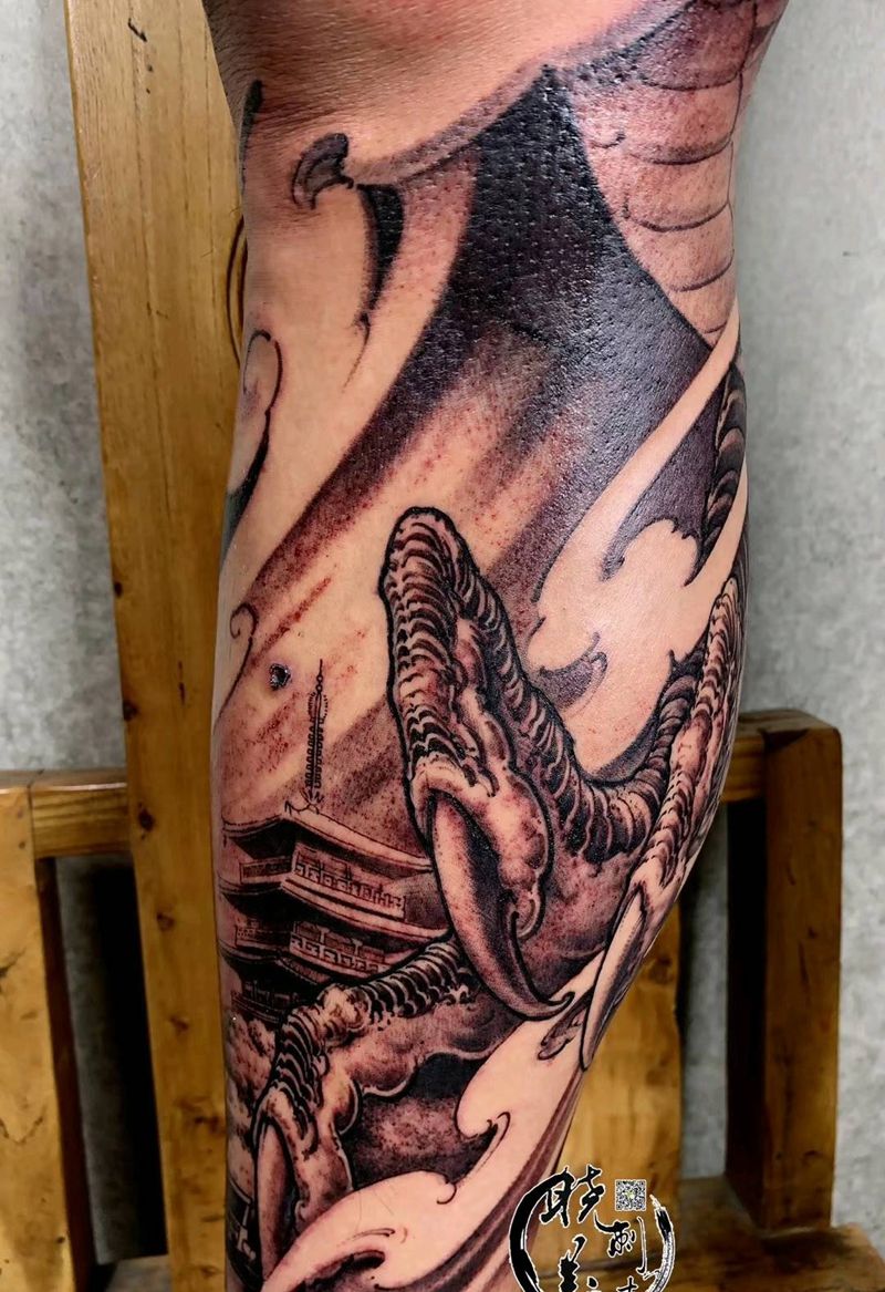 • T网红王老大花腿龙纹身图片_腿部新传统纹身图案
