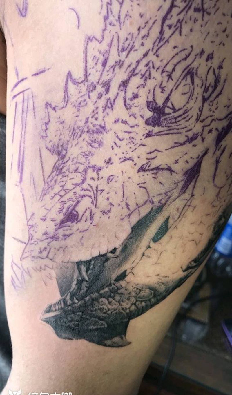 • T网红王老大花腿龙纹身图片_腿部新传统纹身图案