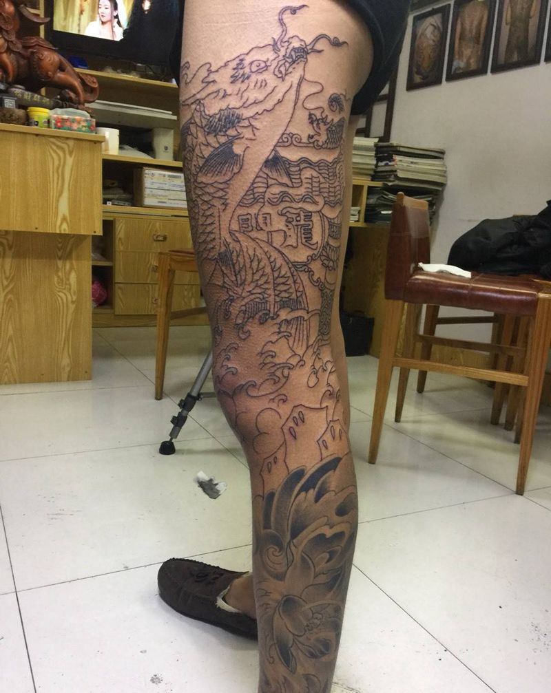 • T网红王老大花腿龙纹身图片_腿部新传统纹身图案