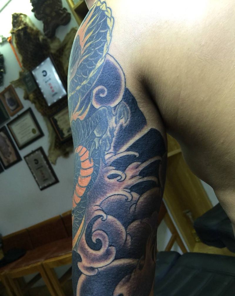• T网红王老大花腿龙纹身图片_腿部新传统纹身图案