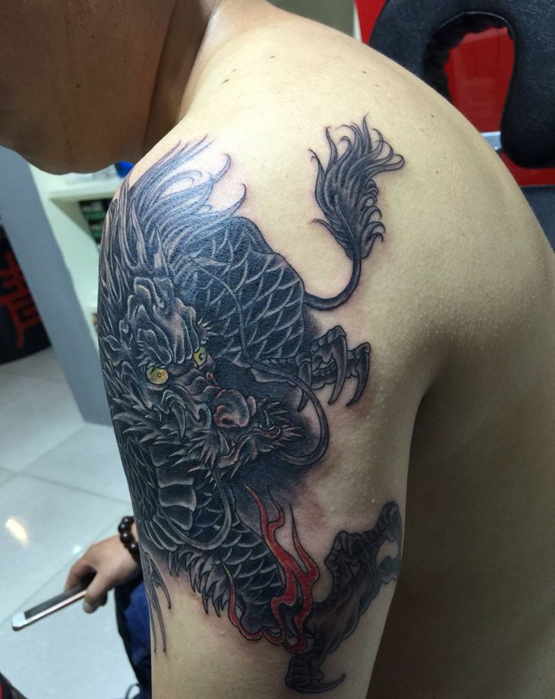 • T网红王老大花腿龙纹身图片_腿部新传统纹身图案