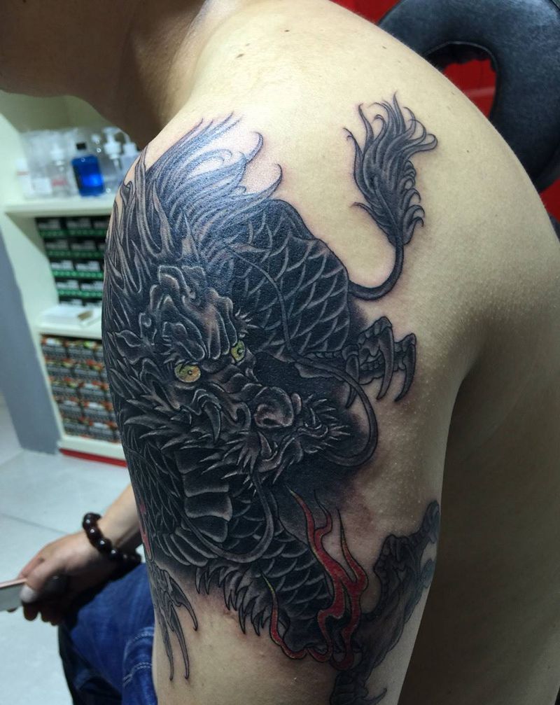 • T网红王老大花腿龙纹身图片_腿部新传统纹身图案