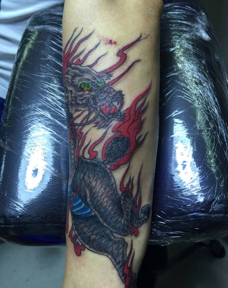 • T网红王老大花腿龙纹身图片_腿部新传统纹身图案