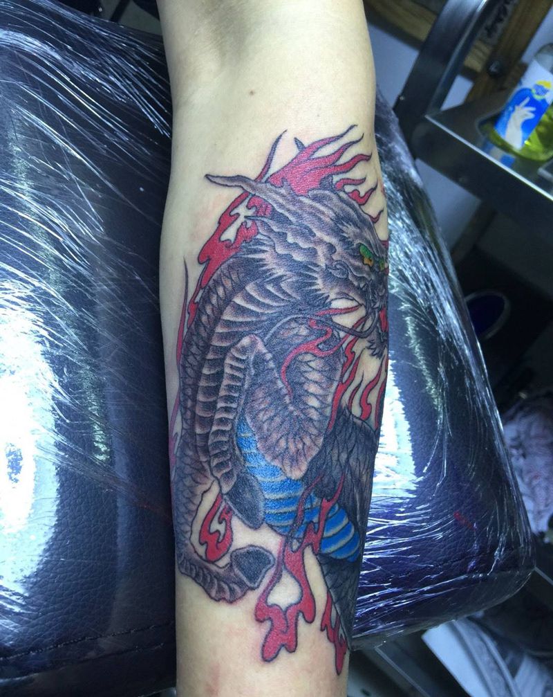 • T网红王老大花腿龙纹身图片_腿部新传统纹身图案