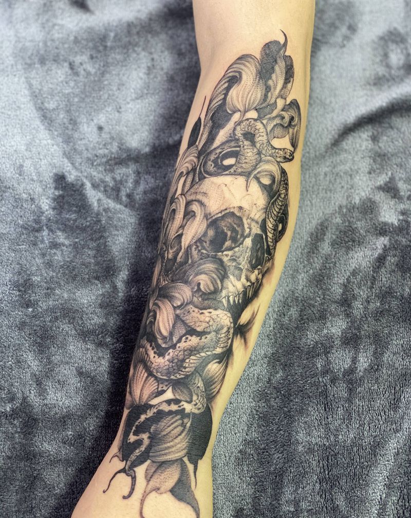 当前位置: 首页 >江苏省常州市纹身店-常州印象纹身纹身图案>骷髅纹身图片_手臂欧美写实纹身图案