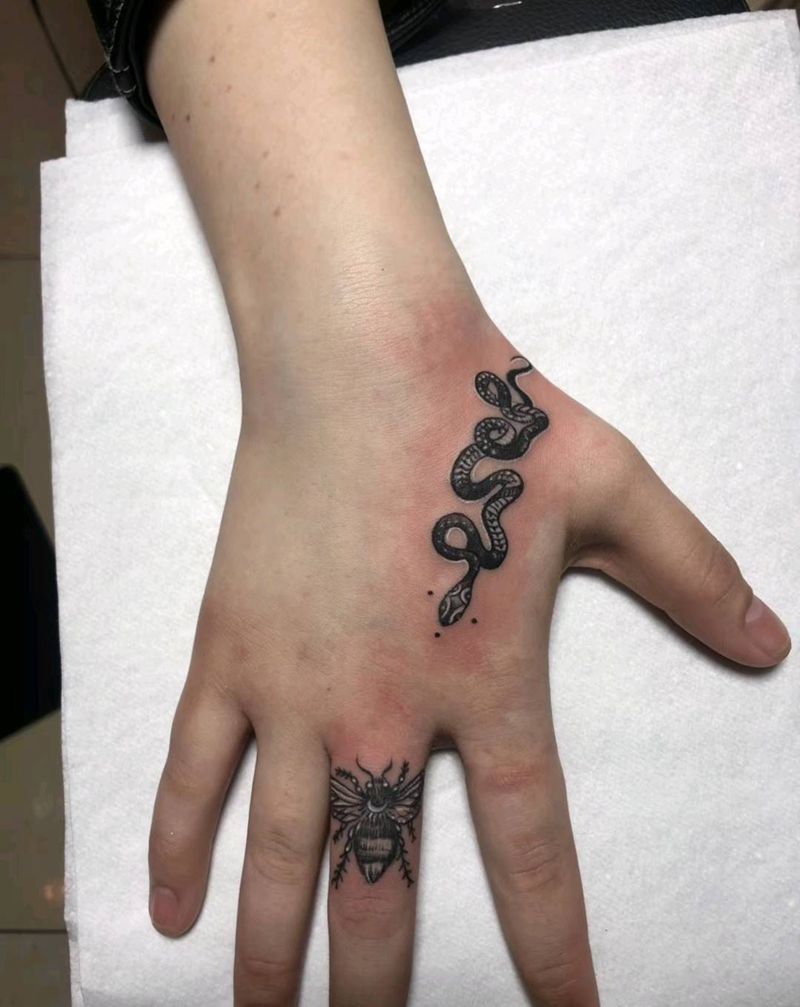 当前位置: 首页 >江苏省常州市纹身店-常州刺青纹身图案>蛇,蜜蜂纹身图片_手部纹身图案