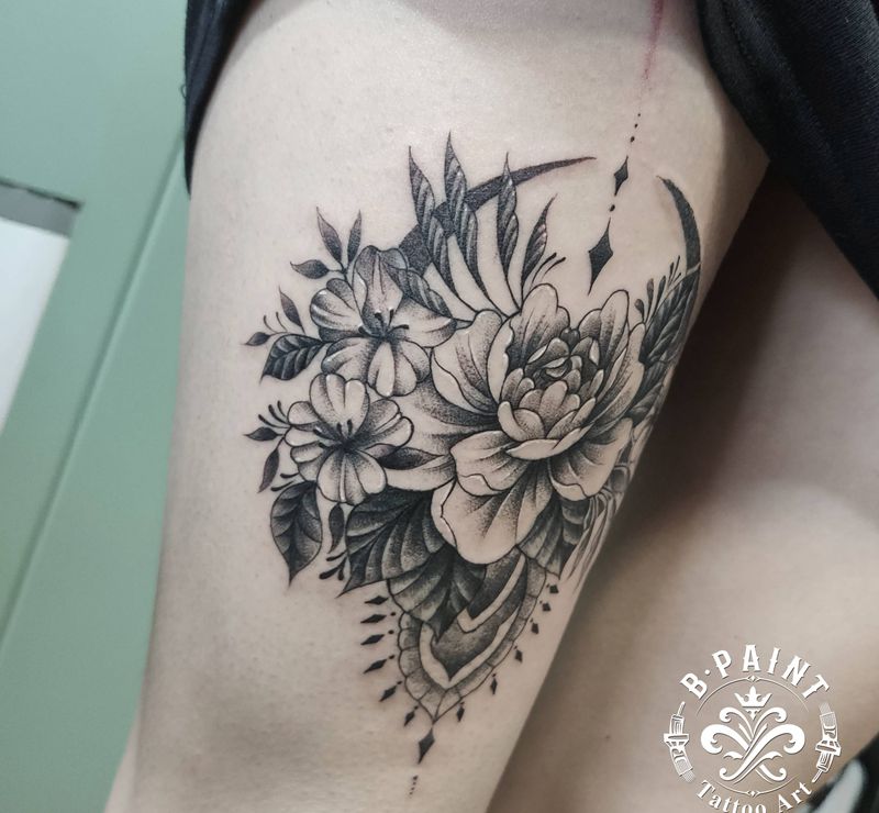 素花纹身图片_腿部点刺纹身图案