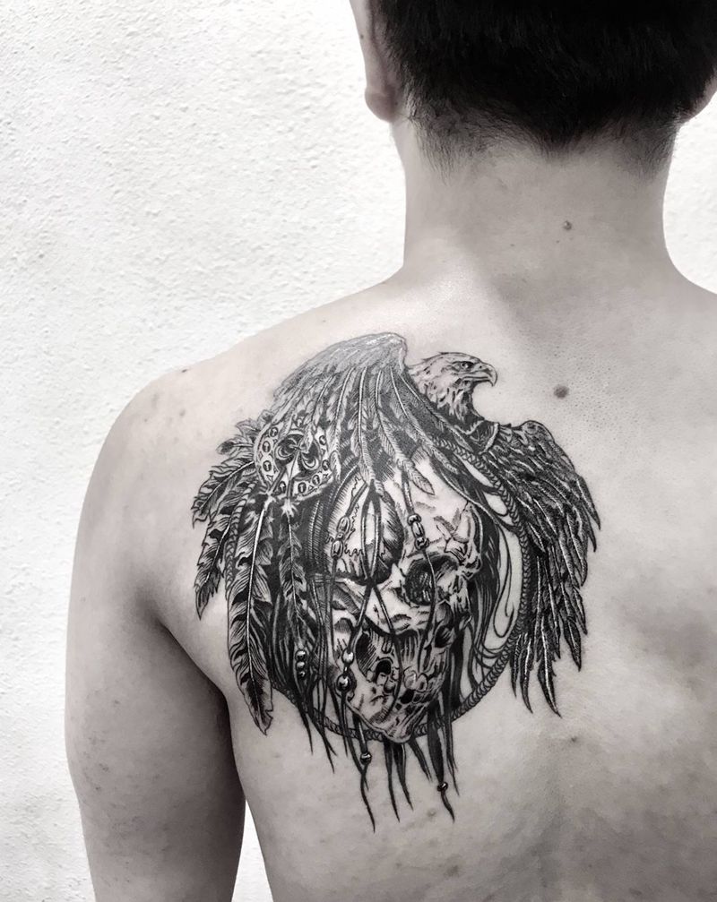 鹰与骷髅纹身图片_背部鹰骷髅暗黑纹身图案