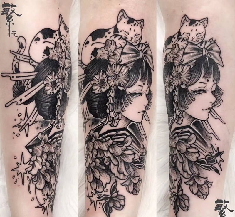 当前位置: 首页 >江苏省苏州市纹身店-苏州繁花艺术刺青纹身图案>艺伎系列纹身图片_手臂臀部点刺老传统纹身图案