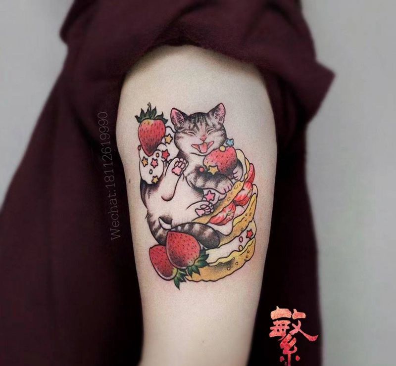 日式·猫纹身图片_手臂New School猫草莓三明治纹身图案