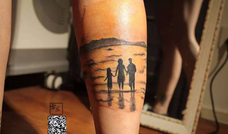 一家三口,幸福之家纹身图片_腿部欧美传统写实成品手稿静物原创人物纹身图案
