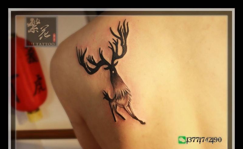 当前位置: 首页 >江苏省苏州市纹身店-苏州繁花艺术刺青纹身图案>麋鹿纹身图片_成品手稿背部动物欧美纹身图案