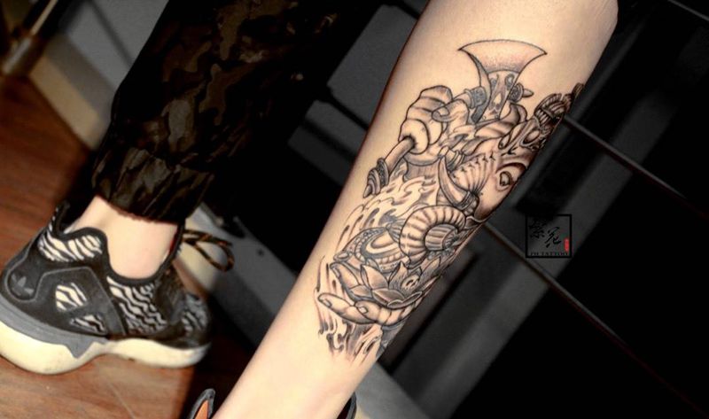 当前位置: 首页 >江苏省苏州市纹身店-苏州繁花艺术刺青纹身图案>象神完成纹身图片_腿部脚部手稿成品动物鬼神纹身图案