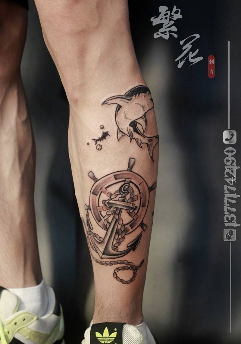 包小腿 拼接纹身图片_成品手稿脚部腿部欧美写实人物动物几何纹身图案