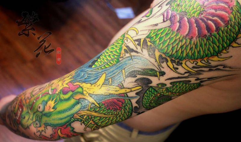 当前位置: 首页 >江苏省苏州市纹身店-苏州繁花艺术刺青纹身图案>龙臂纹身图片_成品手稿手臂手部传统鬼神纹身图案