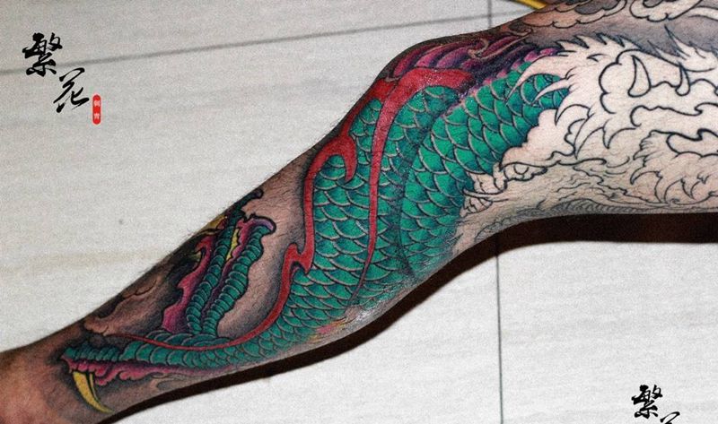 • T网红王老大花腿龙纹身图片_腿部新传统纹身图案
