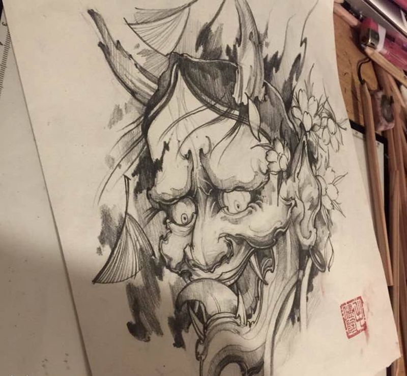 当前位置: 首页 >江苏省苏州市纹身店-苏州繁花艺术刺青纹身图案>新传统手稿纹身图片_成品手稿传统图腾鬼神动物腰部纹身图案