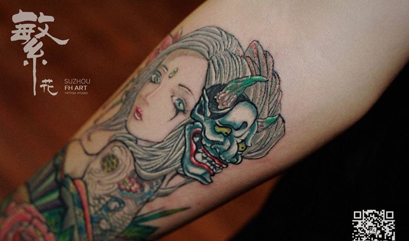 当前位置: 首页 >江苏省苏州市纹身店-苏州繁花艺术刺青纹身图案>艺妓般若纹身图片_成品手稿手臂手部欧美清新写实人物鬼神纹身图案