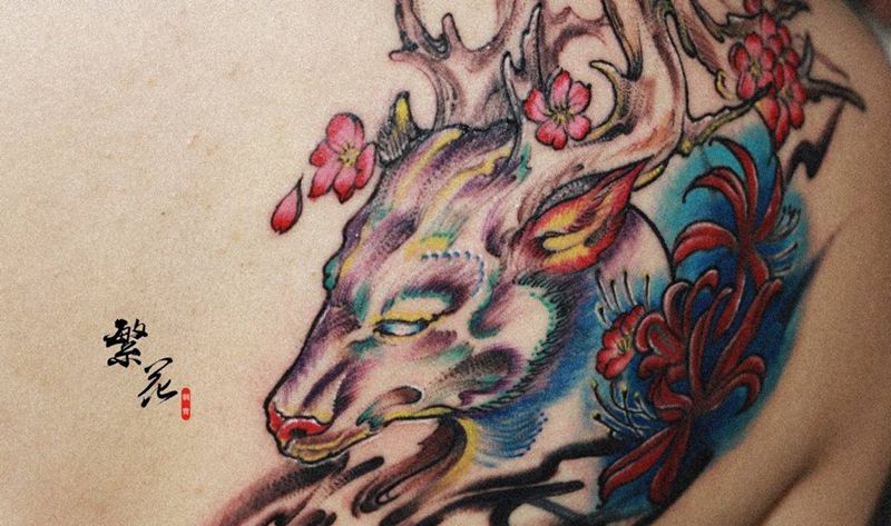 彼岸花添加鹿纹身图片_成品手稿背部肩部传统国画动物静物写实欧美纹身图案