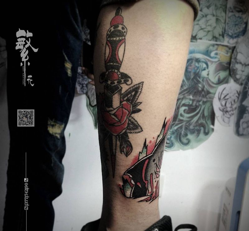 • T网红王老大花腿龙纹身图片_腿部新传统纹身图案