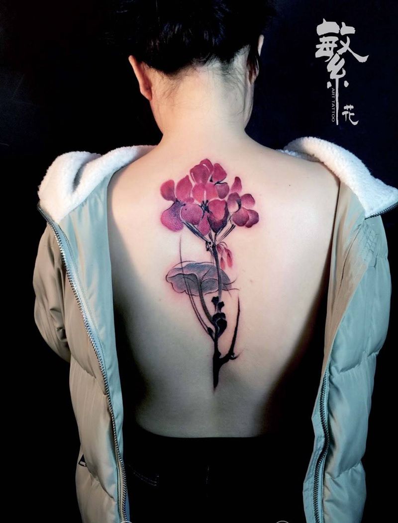 花 荷花 樱花纹身图片_成品手稿背部颈部传统国画写实植物静物原创纹身图案