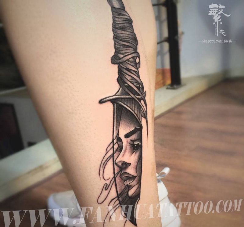 刀剑纹身图片_手稿成品腿部脚部欧美人物原创图腾纹身图案
