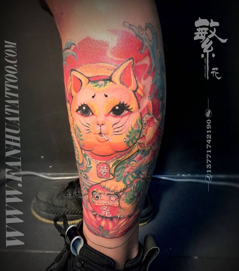 招财猫纹身图片_手稿成品脚部腿部欧美写实动物宗教猫纹身图案