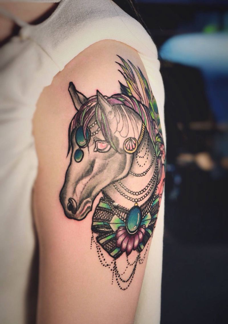 当前位置: 首页 >江苏省苏州市纹身店-苏州繁花艺术刺青纹身图案>马纹身图片_成品手稿手臂手部欧美动物纹身图案