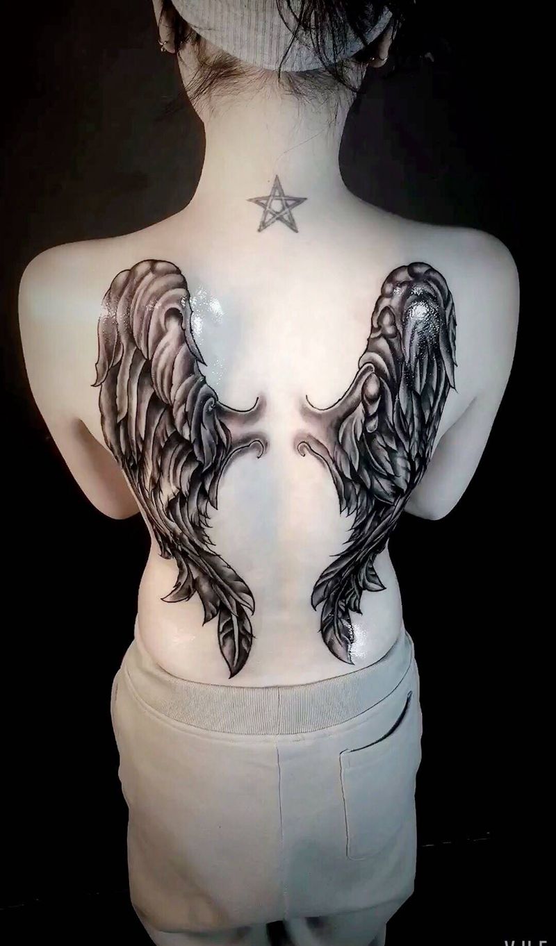 天使翅膀纹身图片_成品手稿背部传统欧美静物满背翅膀纹身图案