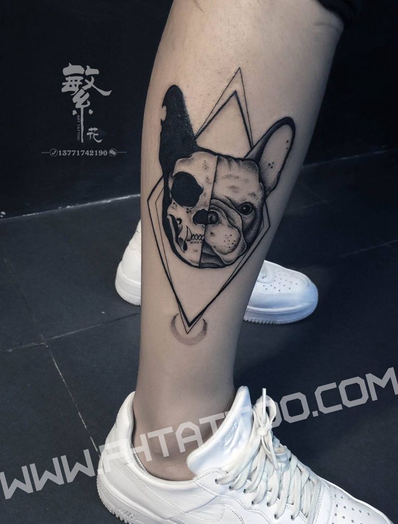 法斗的前世今生纹身图片_成品手稿脚部腿部写实清新几何动物法斗纹身图案