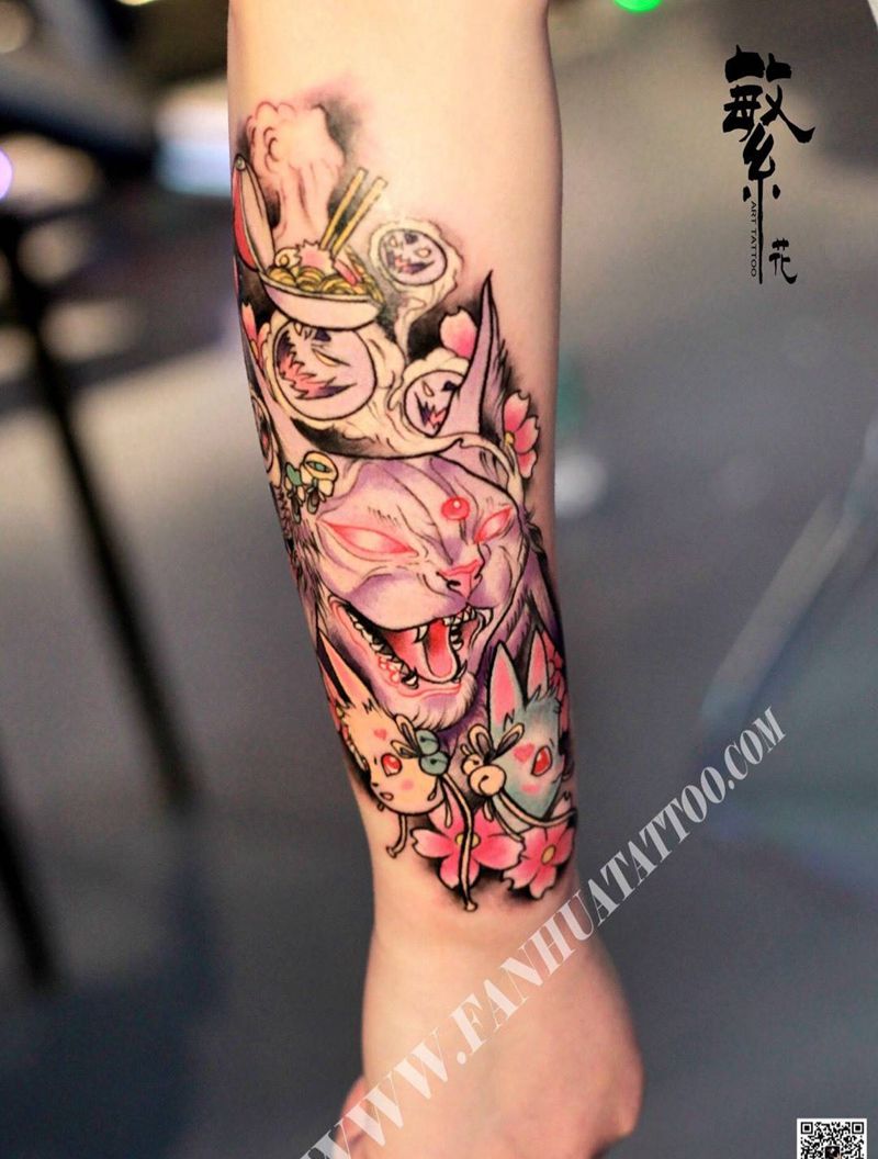 猫 面具 粉紫纹身图片_手稿成品手臂手部欧美动物花臂纹身图案