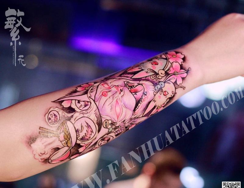 猫 面具 粉紫纹身图片_手稿成品手臂手部欧美动物花臂纹身图案