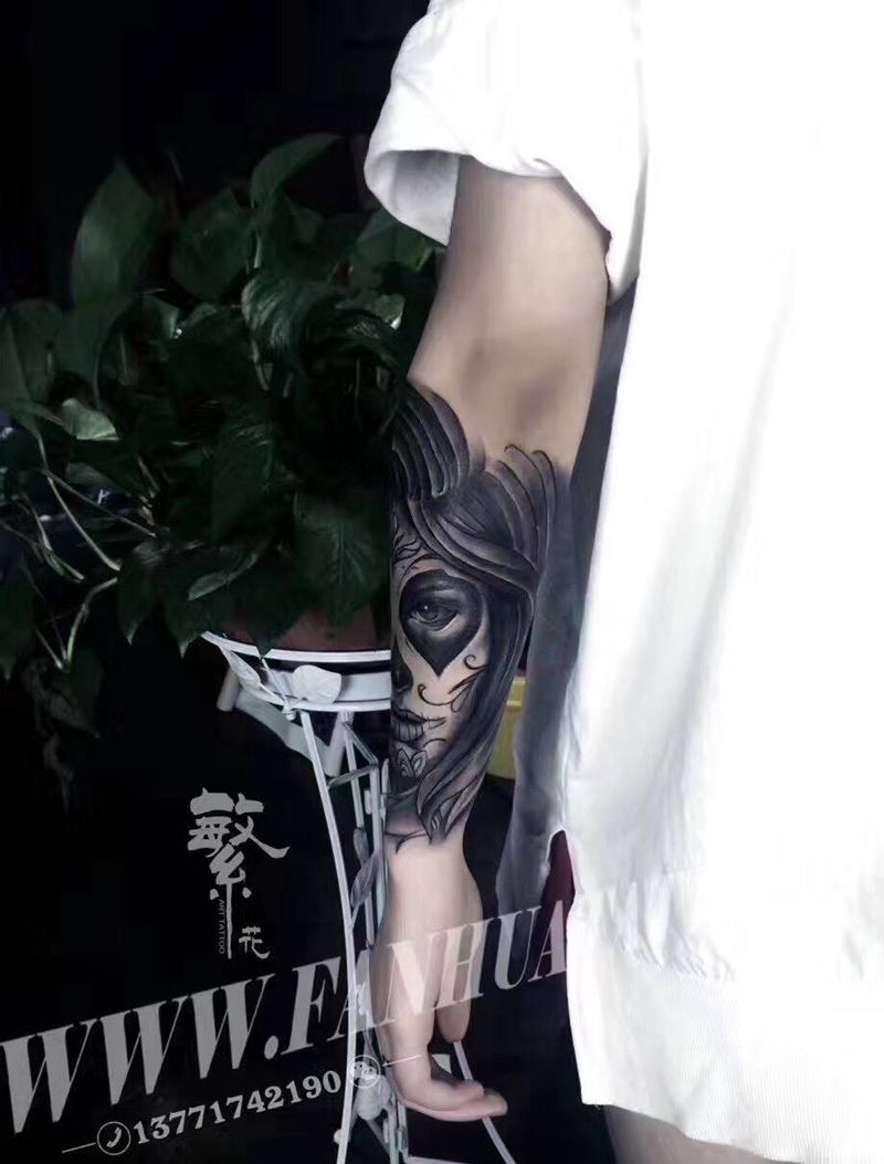 当前位置: 首页 >江苏省苏州市纹身店-苏州繁花艺术刺青纹身图案>暗黑女神纹身图片_成品手稿手臂手部欧美写实人物原创纹身图案