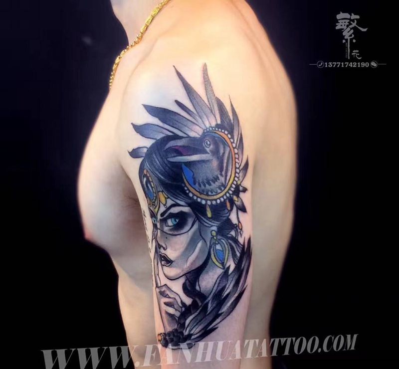 印第安女郎纹身图片_手稿成品手臂欧美人物纹身图案