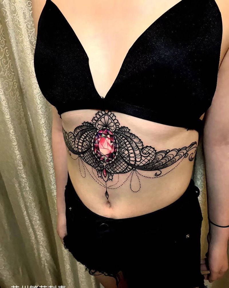 宝石下胸花纹身图片_成品手稿胸部欧美图腾几何写实纹身图案