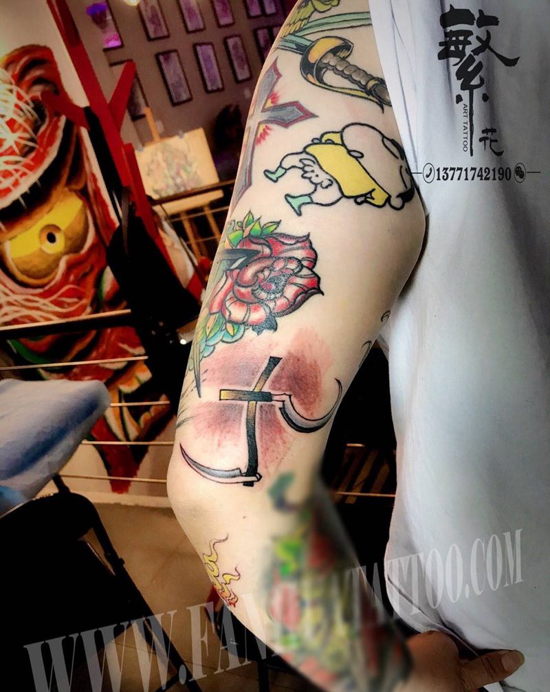 拼接花臂纹身图片_成品手稿手臂手部欧美人物植物动物静物纹身图案