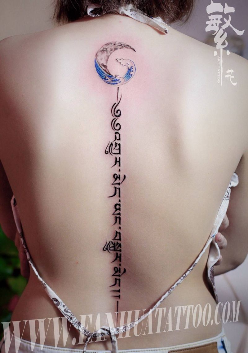 脊柱梵文纹身图片_成品背部欧美字符动物纹身图案