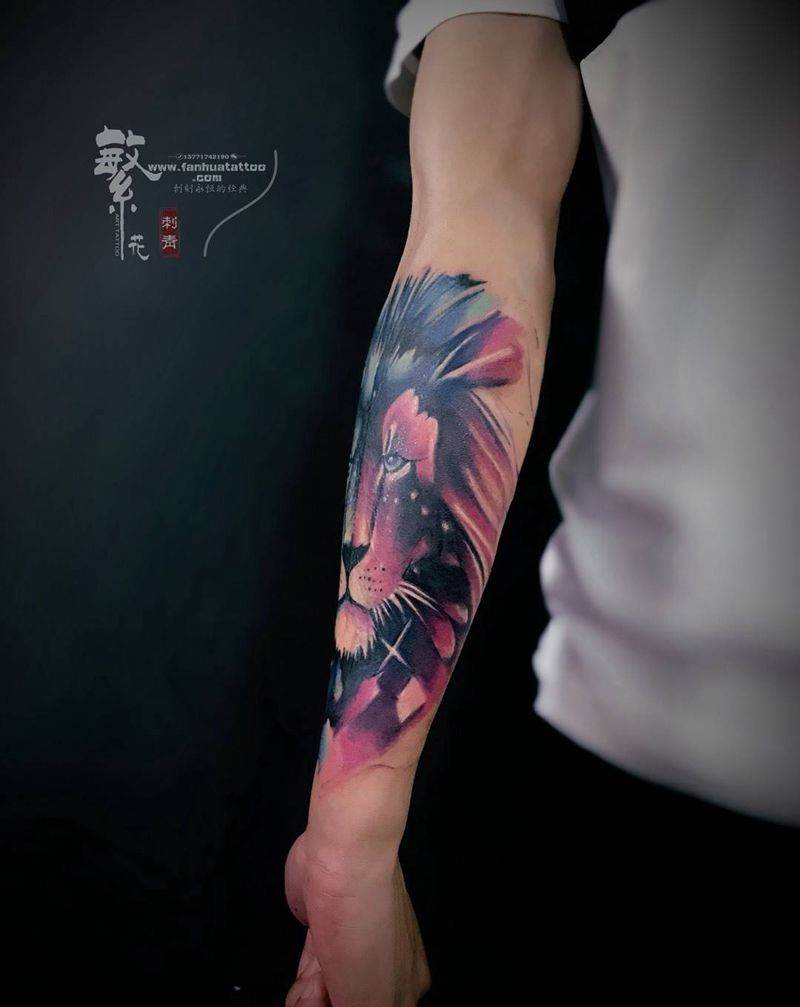 当前位置: 首页 >江苏省苏州市纹身店-苏州繁花艺术刺青纹身图案>狮子遮盖纹身图片_成品手臂欧美动物纹身图案