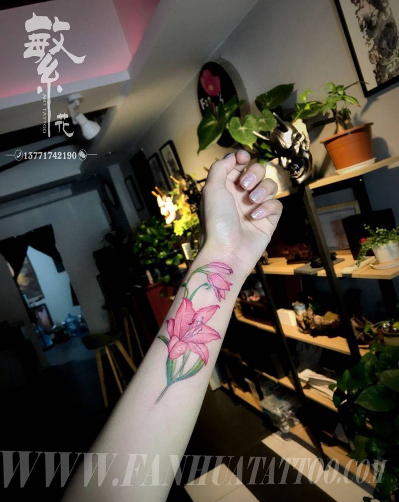 当前位置: 首页 >江苏省苏州市纹身店-苏州繁花艺术刺青纹身图案>百合遮盖纹身图片_成品手稿手部手臂清新传统植物原创伤疤遮盖纹身图案