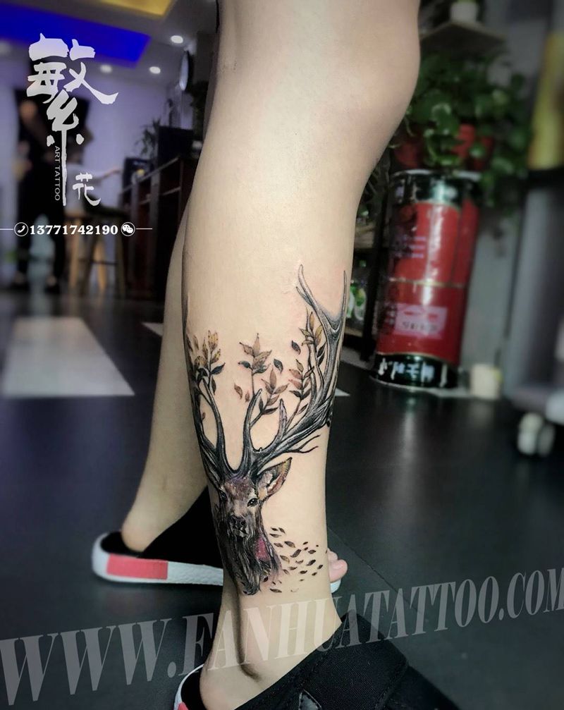 当前位置: 首页 >江苏省苏州市纹身店-苏州繁花艺术刺青纹身图案>鹿纹身图片_成品手稿腿部欧美动物纹身图案