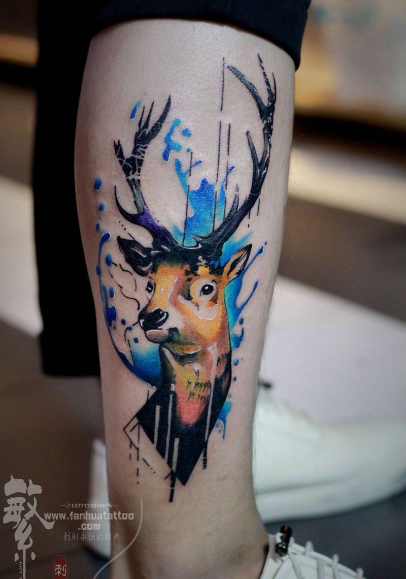 当前位置: 首页 >江苏省苏州市纹身店-苏州繁花艺术刺青纹身图案>水彩鹿纹身图片_成品手稿腿部欧美清新动物原创纹身图案