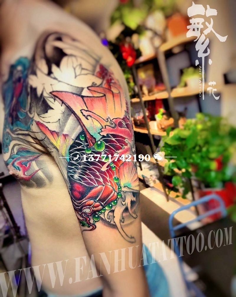 当前位置: 首页 >江苏省苏州市纹身店-苏州繁花艺术刺青纹身图案>锦鲤纹身图片_成品手稿手臂传统动物花臂纹身图案