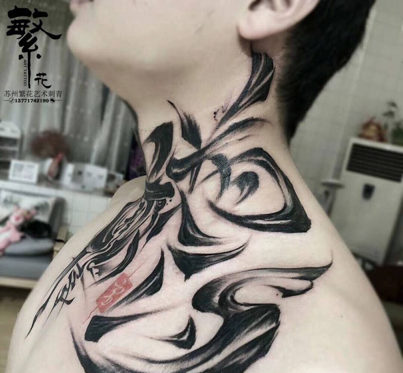 当前位置: 首页 >江苏省苏州市纹身店-苏州繁花艺术刺青纹身图案>中国风汉字纹身图片_成品手稿胸部颈部传统字符原创花体字纹身图案