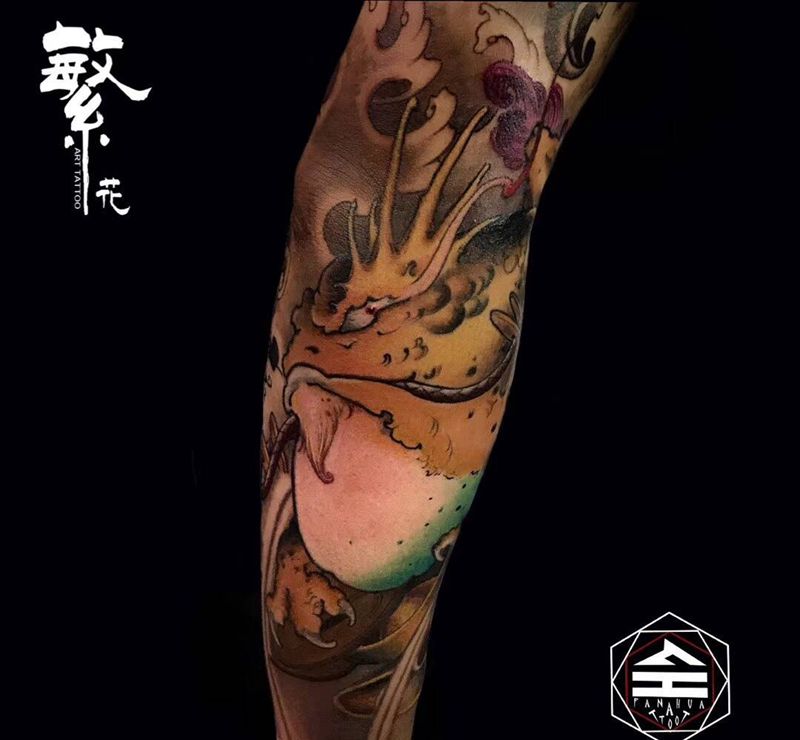• T网红王老大花腿龙纹身图片_腿部新传统纹身图案