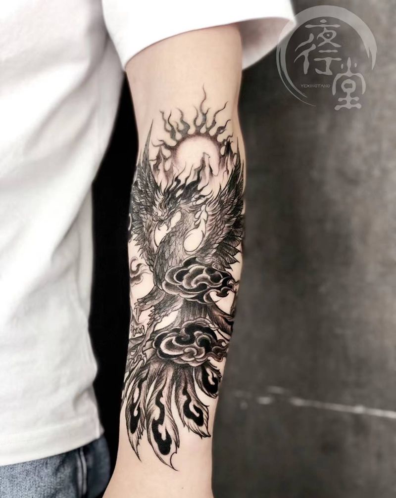 当前位置: 首页 >江苏省苏州市纹身店-苏州夜行堂纹身馆纹身图案>凤凰纹身图片_手臂腿部新传统点刺纹身图案
