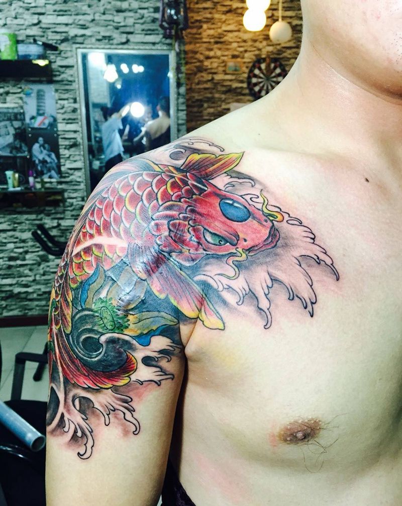 当前位置: 首页 >江苏省苏州市纹身店-苏州夜行堂纹身馆纹身图案>鲤鱼遮盖疤痕和图案纹身图片