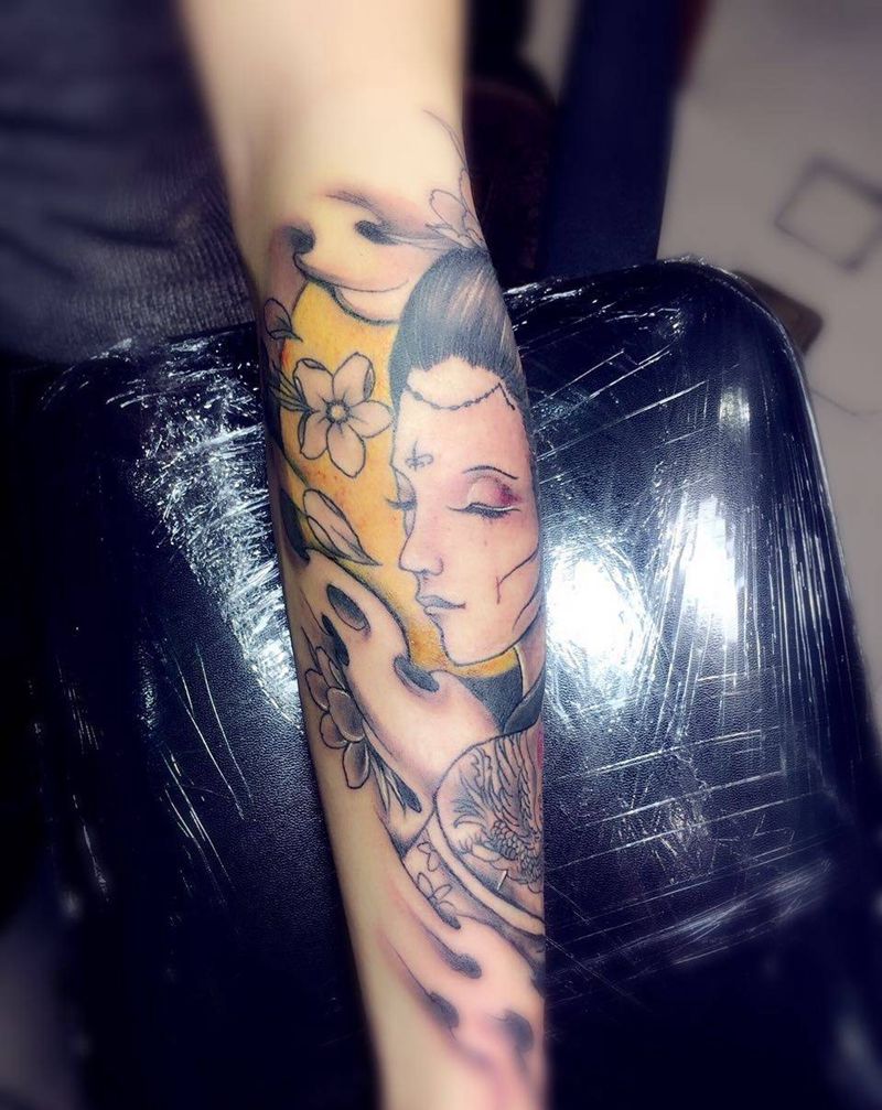 当前位置: 首页 >江苏省苏州市纹身店-苏州夜行堂纹身馆纹身图案>艺妓纹身图片_成品腿部手臂肩部人物传统纹身图案