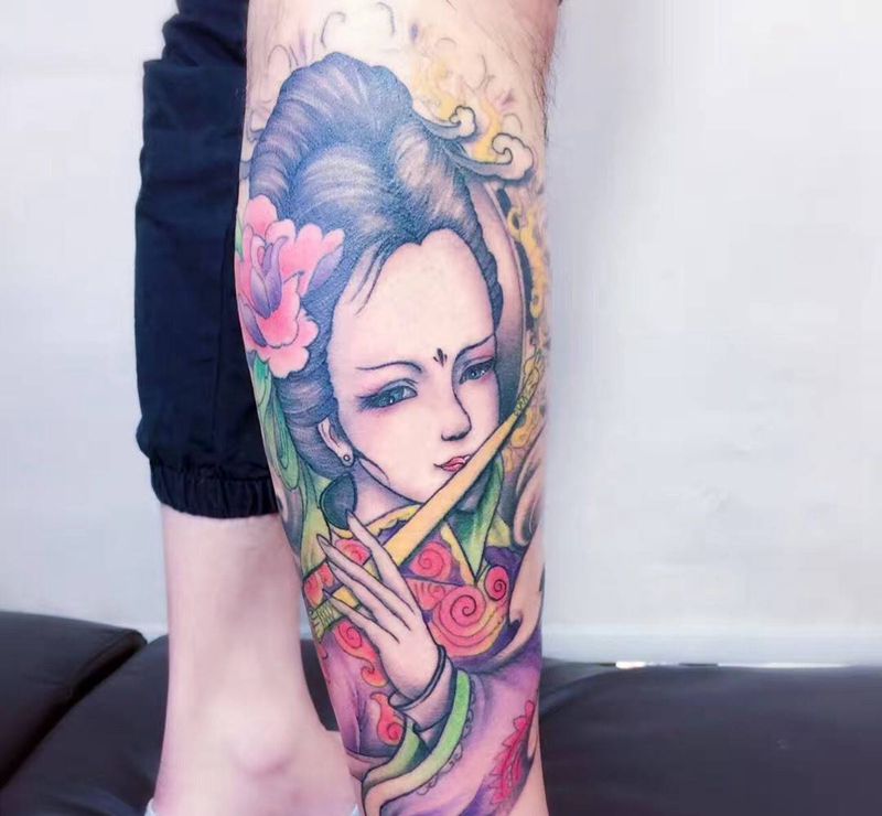 当前位置: 首页 >江苏省苏州市纹身店-苏州夜行堂纹身馆纹身图案>修改上色纹身图片_成品腿部背部手臂肩部肖像传统人物纹身图案